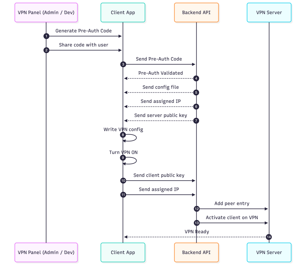 This section explains the complete lifecycle of how a new client is onboarded into the VPN using a pre-authentication flow. The goal is to keep the process simple for users while ensuring that the backend has full control over authentication, configuration, and peer activation.