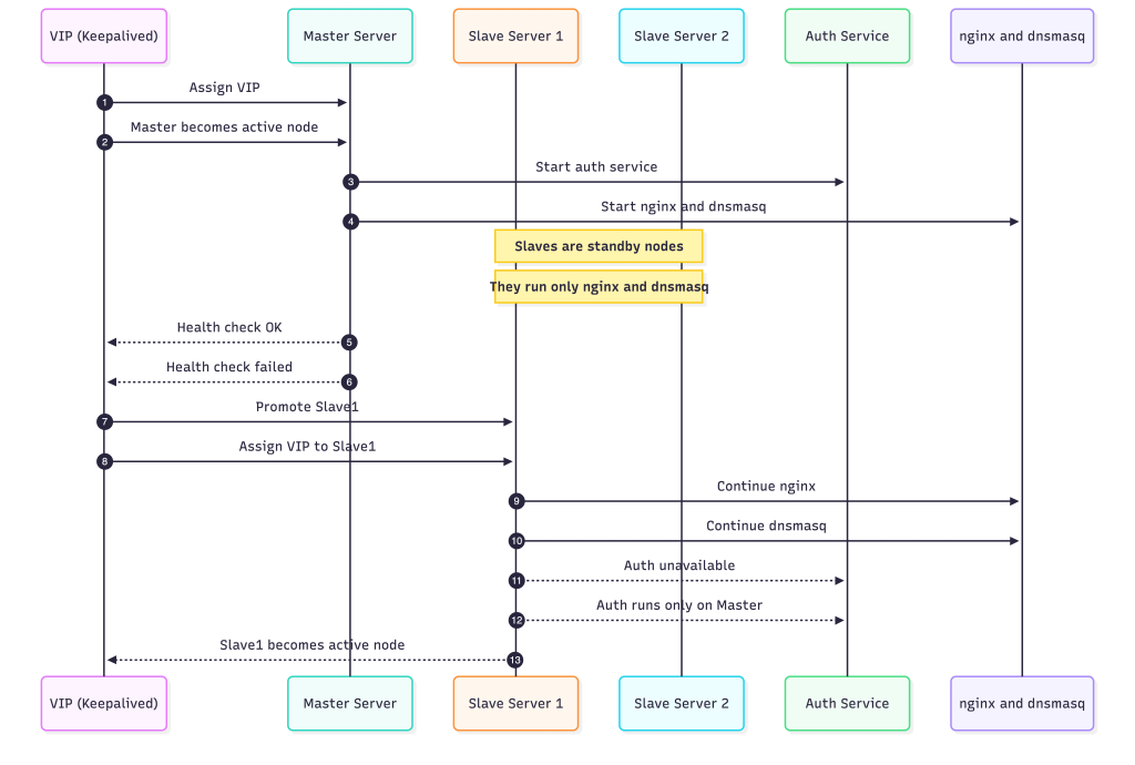 The slave servers continuously monitor the master through Keepalived’s health-check mechanism. If the master becomes unreachable, the VIP instantly moves to the highest-priority slave. That server immediately becomes the new active node. Since nginx and dnsmasq are already running on every slave, they start serving traffic without needing any extra setup. The only part that does not move is the authentication service, which is intentionally bound to the master. This keeps the system simple and avoids data-consistency issues across nodes.