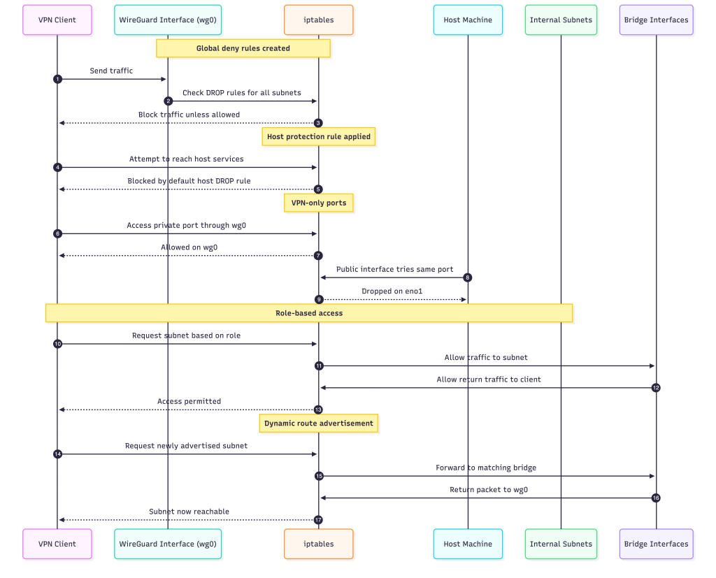 The VPN manager uses iptables to control how every user interacts with the internal network. The idea is simple: nothing is allowed by default, and all access is explicitly granted based on the user’s role and the subnets they are permitted to reach.