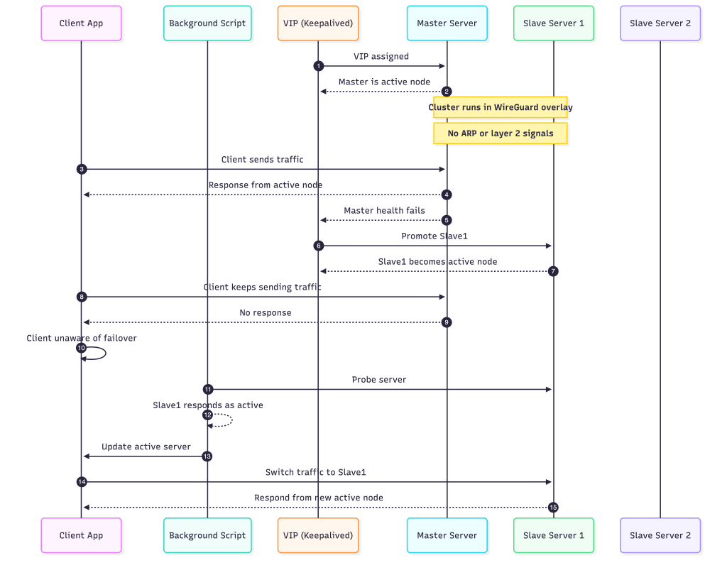 The entire cluster lives inside a WireGuard overlay, which means the nodes never share a real layer-2 network. Everything they see is already encapsulated. - Traditional VIP failover signals do not exist.