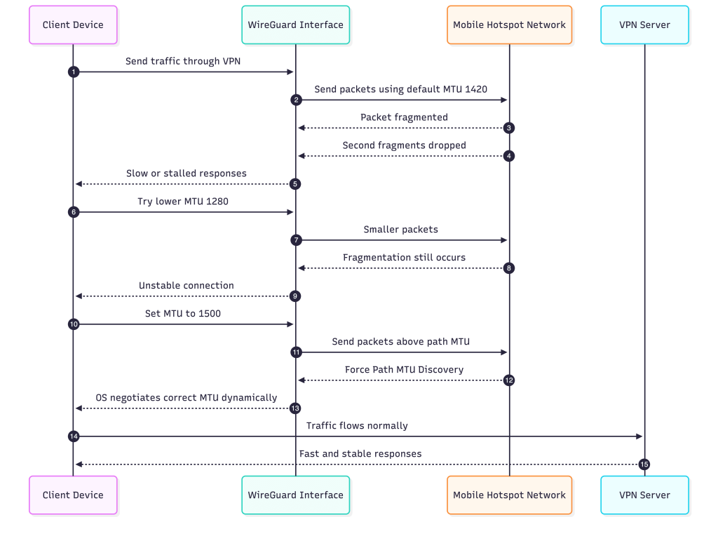 Mobile networks usually operate with smaller path MTUs compared to broadband. WireGuard uses 1420 bytes by default. On the hotspot this value turned out to be too high. The packets still left the client, but they were being fragmented by the hotspot network. This would normally be fine, except that many carriers silently drop the second fragment. The result was a connection that looked alive but could not deliver anything useful to the application.